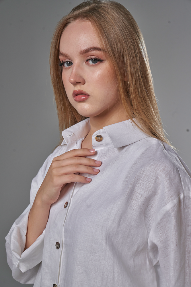 قميص كتان يعطي ملمس مريح وبارد , مع ازارير الصدف المموج من أعماق البحر لتظهري بمظهر مميز وأنيق, وشنطة فاخرة لتحملي بها اغراضك.