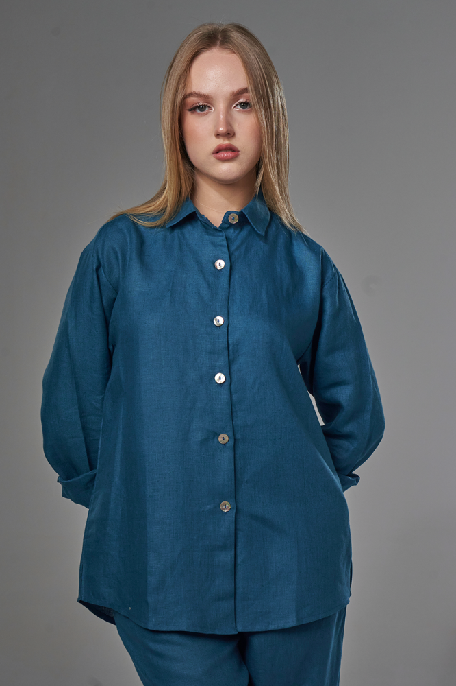 قميص كتان يعطي ملمس مريح وبارد , مع ازارير الصدف من أعماق البحر لتظهري بمظهر مميز وأنيق, وشنطة فاخرة لتحملي بها اغراضك.