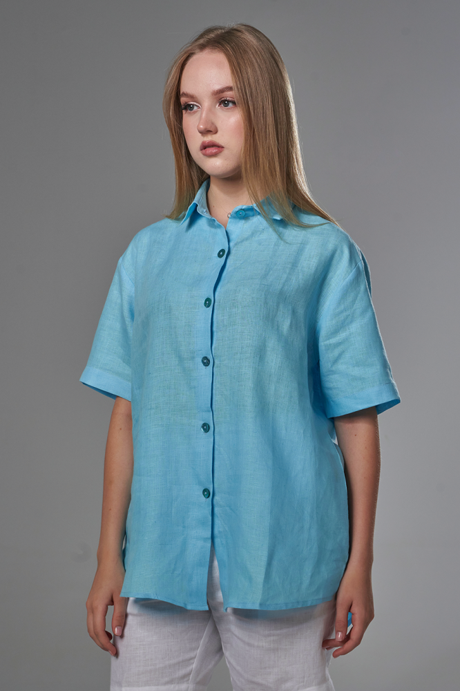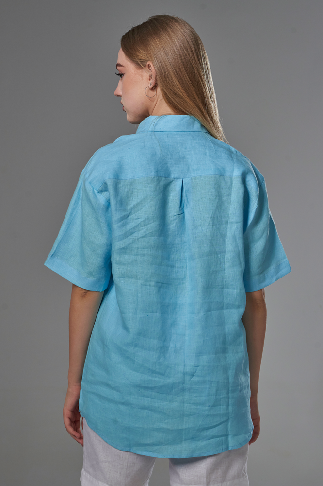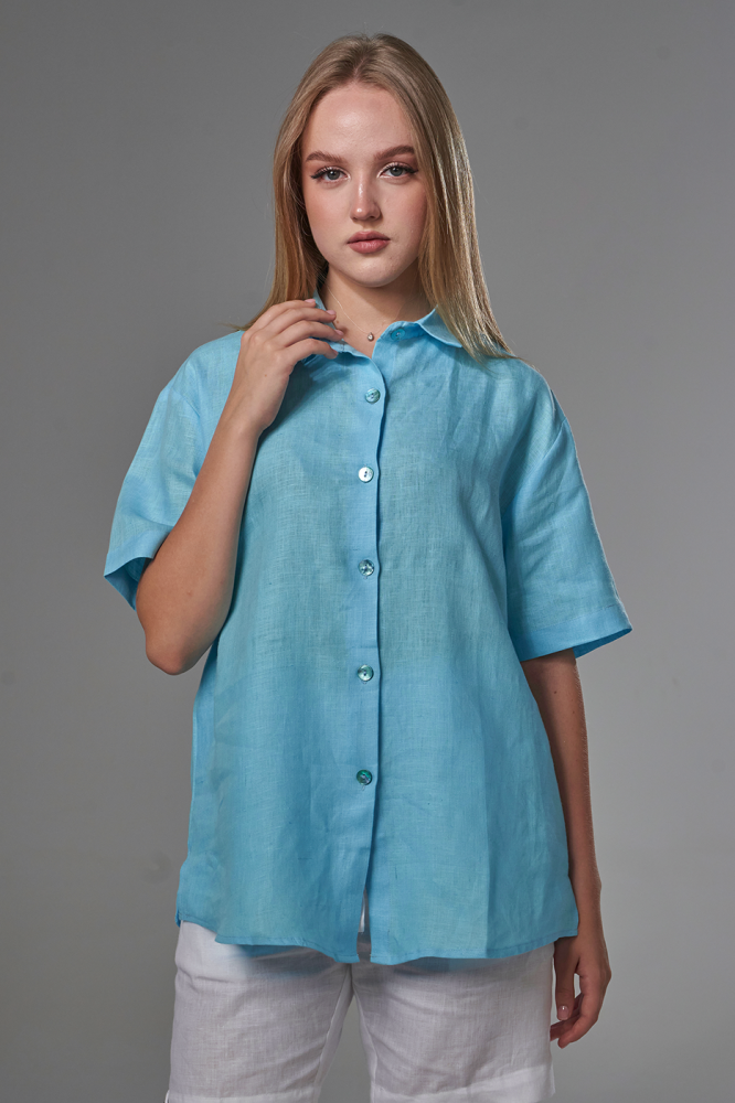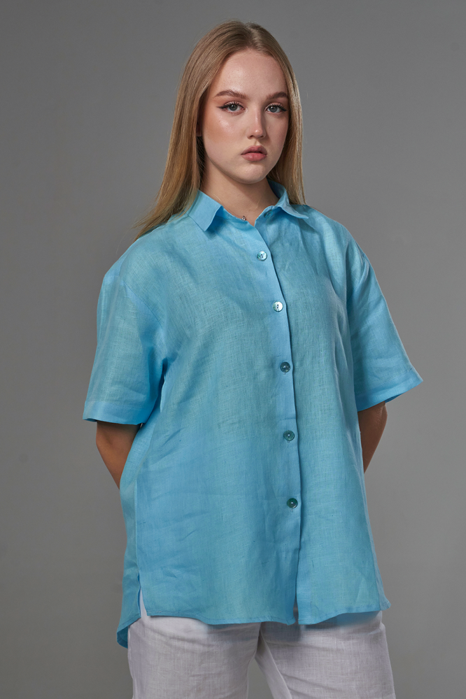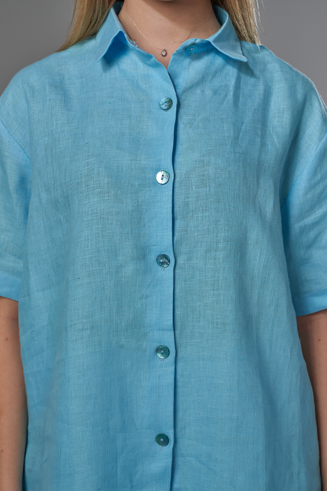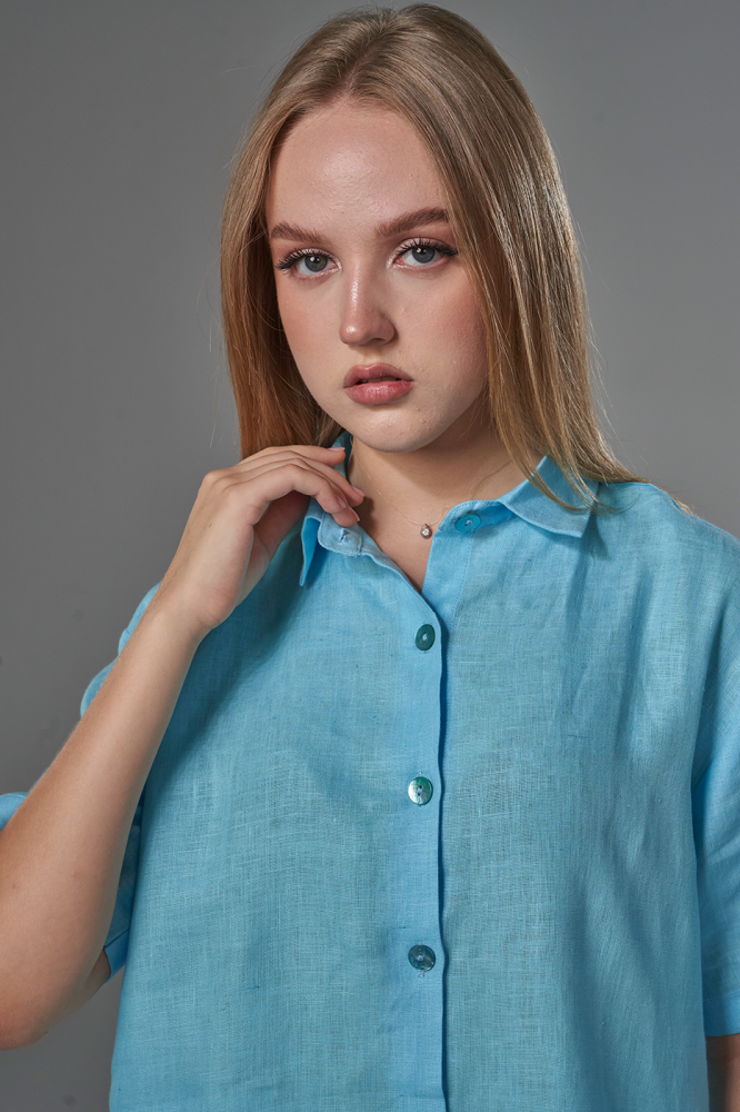 قميص كتان يعطي ملمس مريح وبارد , مع ازارير الصدف من أعماق البحر لتظهري بمظهر مميز وأنيق, وشنطة فاخرة لتحملي بها اغراضك.