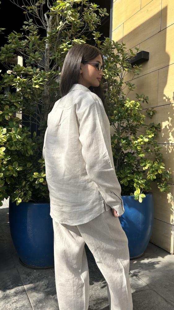قميص كتان يعطي ملمس مريح وبارد , مع ازارير `ذهبية لتظهري بمظهر مميز وأنيق, وشنطة فاخرة لتحملي بها اغراضك.
