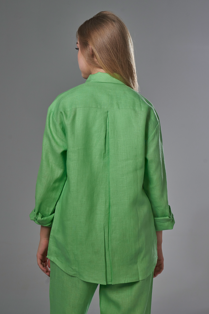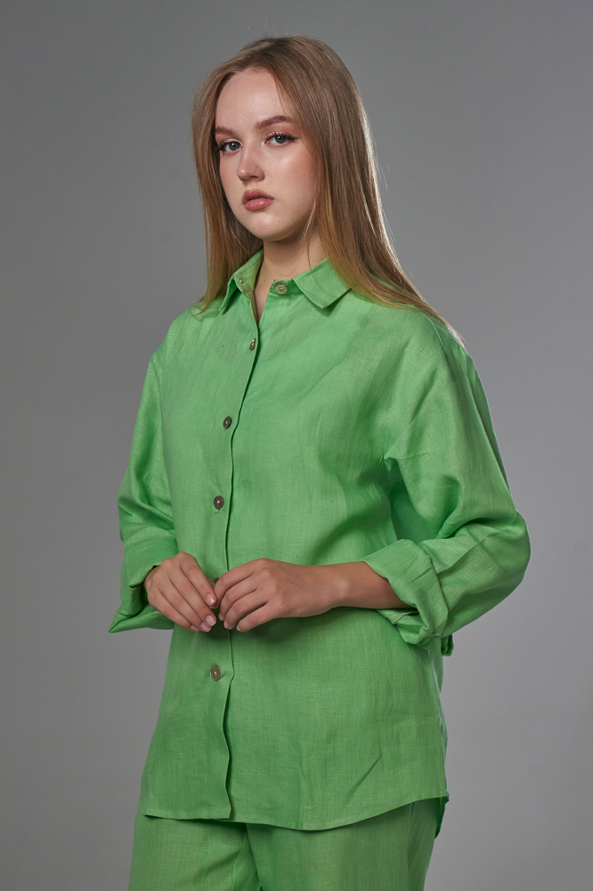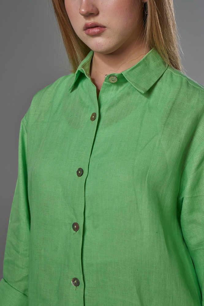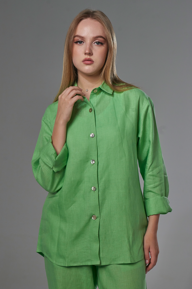 قميص كتان يعطي ملمس مريح وبارد , مع ازارير الصدف من أعماق البحر لتظهري بمظهر مميز وأنيق, وشنطة فاخرة لتحملي بها اغراضك.
