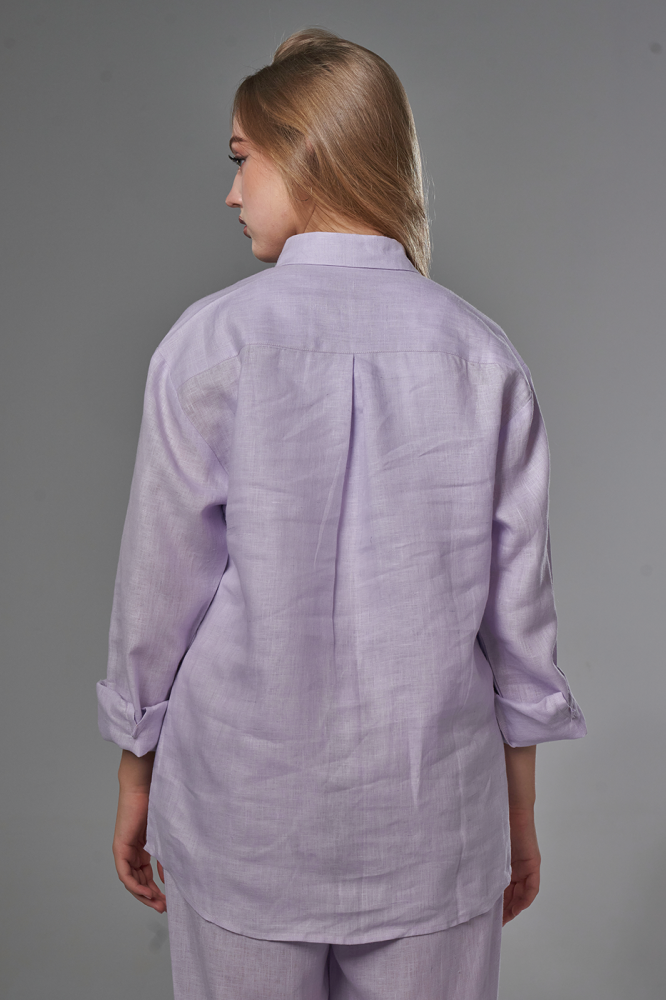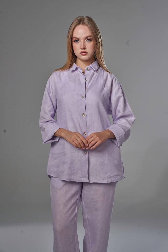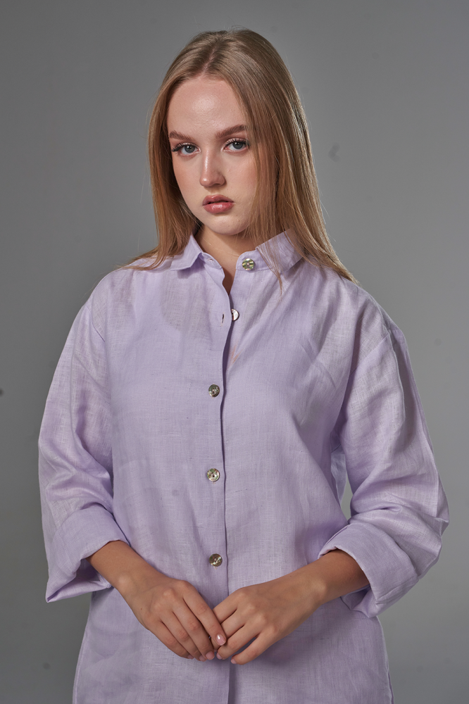 قميص كتان يعطي ملمس مريح وبارد , مع ازارير الصدف من أعماق البحر لتظهري بمظهر مميز وأنيق, وشنطة فاخرة لتحملي بها اغراضك.