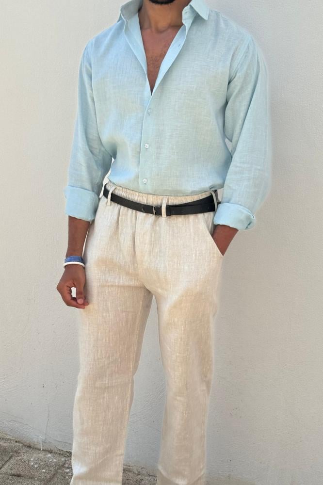 اللون السماوي يعطي حضوراً هادئاً ومريحاً للعين، ويضفي لمسة شبابية على إطلالتك سواء كنت من محبّي الإطلالات الكاجوال الراقية أو تفضّل إرتداء قمصان كتان شبابي بخامة عملية وخفيفة.